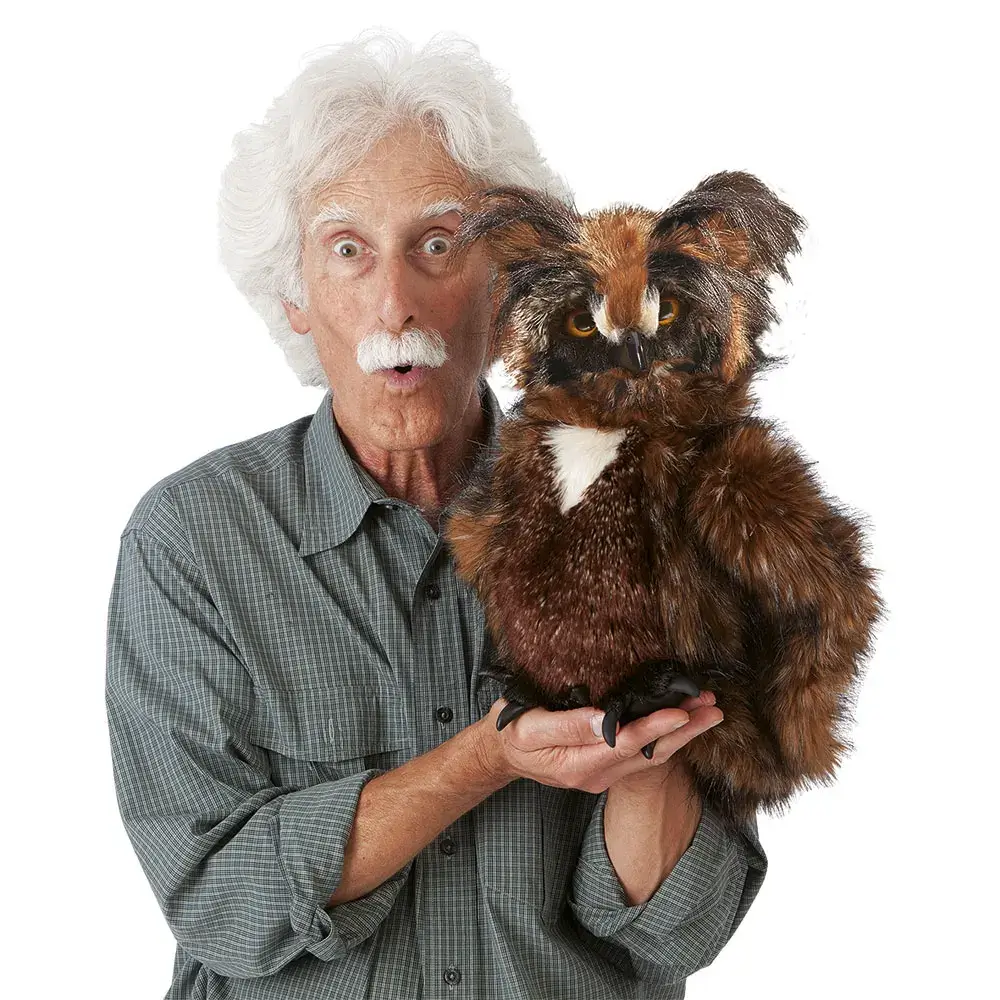 Die Waldohreule ist eine beunruhigende Schönheit. Groß, stumm, mit geschwungenen "Ohren" blickt sie streng aus ihren gelben Augen. In der Nacht, im Dunkeln, wenn wir kaum etwas sehen, erschreckt sie uns mit einem plötzlichen "Schuuu-huu" und wir sind froh, dass wir nicht kleiner sind als sie. Diese herrlich verarbeitete Handpuppe beeindruckt durch federähnlichen Plüsch, bewegliche Flügel, einen rotierenden Kopf und blinzelnde Augen