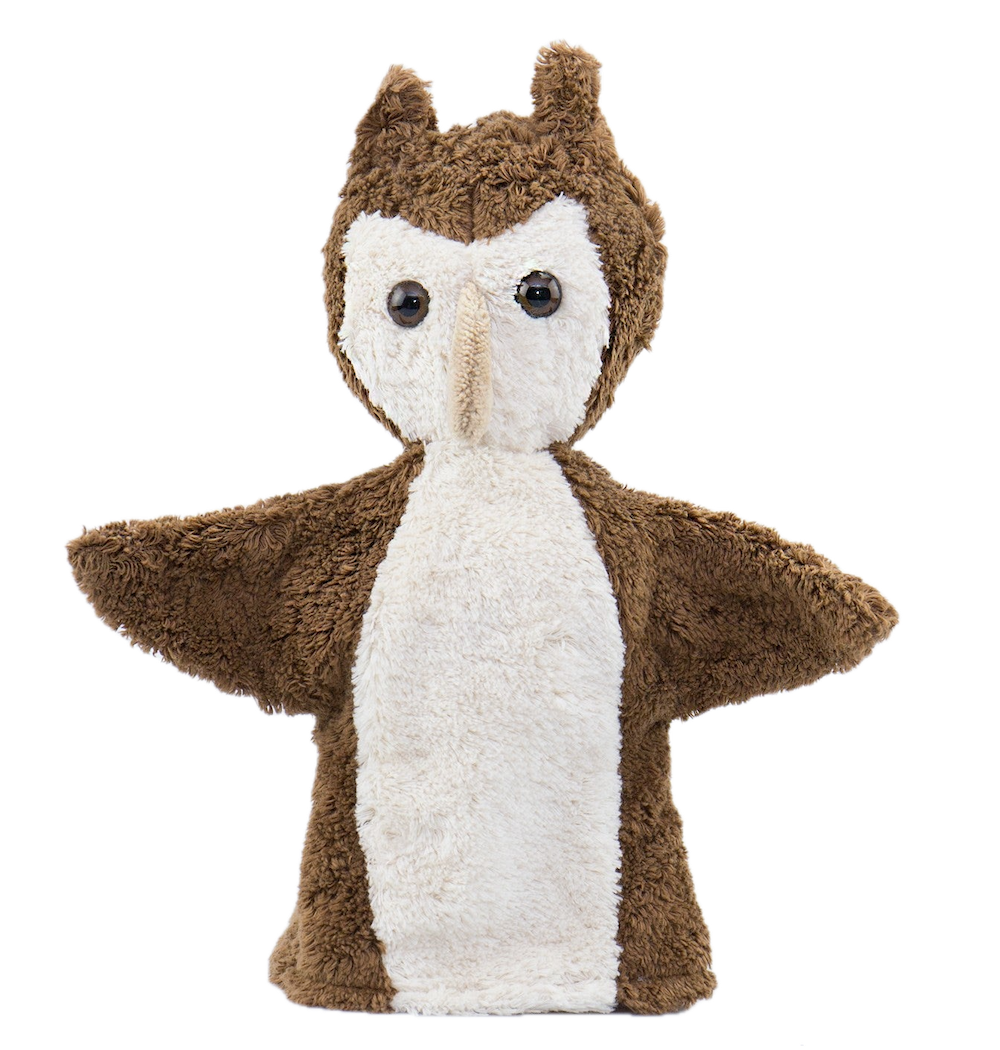Die Handpuppe Eule von Kallisto, gefertigt in Deutschland, ist ca. 30 cm groß und Fell und Füllung aus Baumwolle kbA (kontrolliert biologischer Anbau), waschbar (Wollwaschgang, Handwäsche), vegan