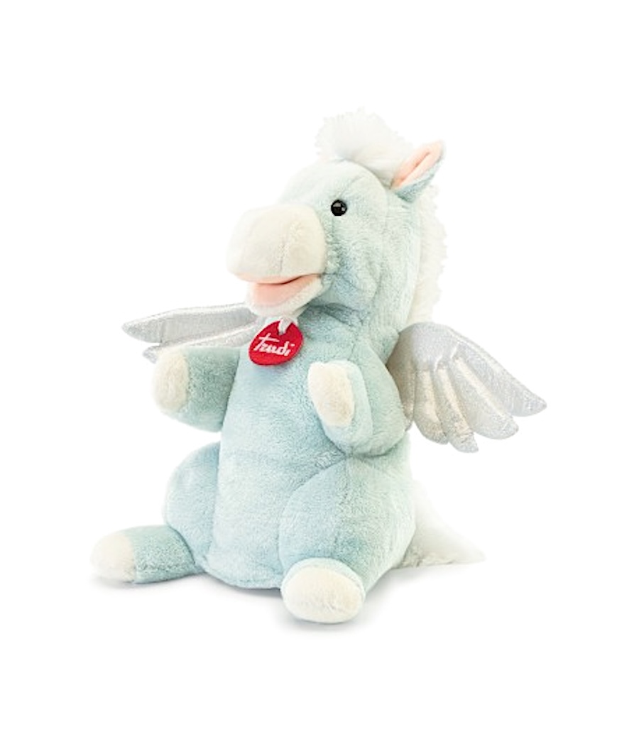 Ein kuscheliges zauberhaftes Pegasus Pferdchen als Trudi Handpuppe. Die Handpuppe ist bei 30° C waschbar, alternativ kann sie auch mit der Hand, einen Schwamm und milder Seife gewaschen werden.